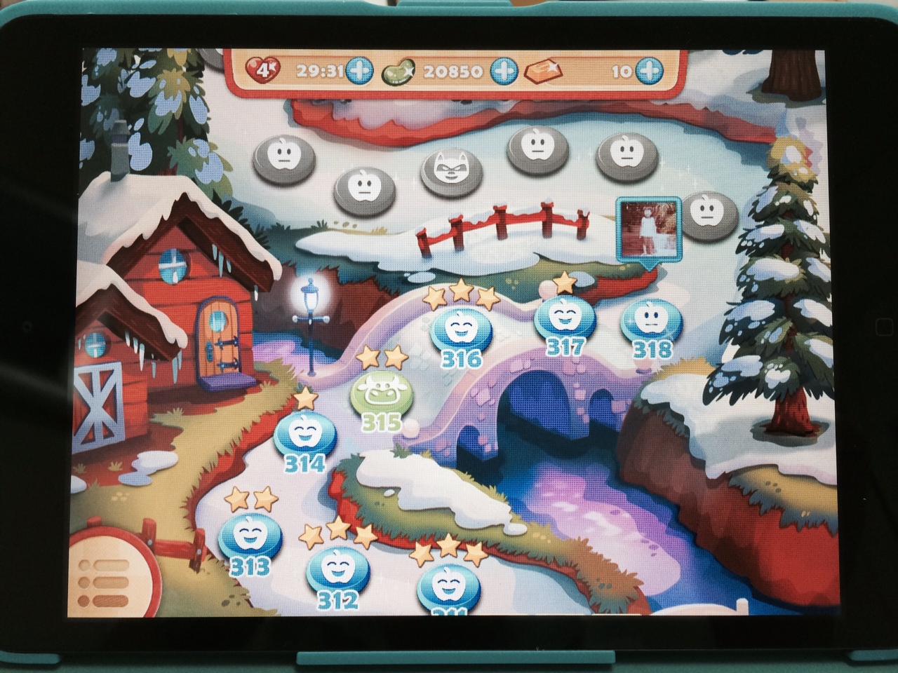 Right after I made it pass Level 314 in Farm Heroes over the weekend, I discovered I was not in synch with all my three devices! Oh no!!! So intent I was at Level 318 (on the iPad), I discovered I couldn’t carry on with the game in Facebook on the laptop or in its app on the iPhone5S because on these two, I am still at Level 314 while on the iPad (where I farm most of the time), I have progressed on to 318. Eeesh.