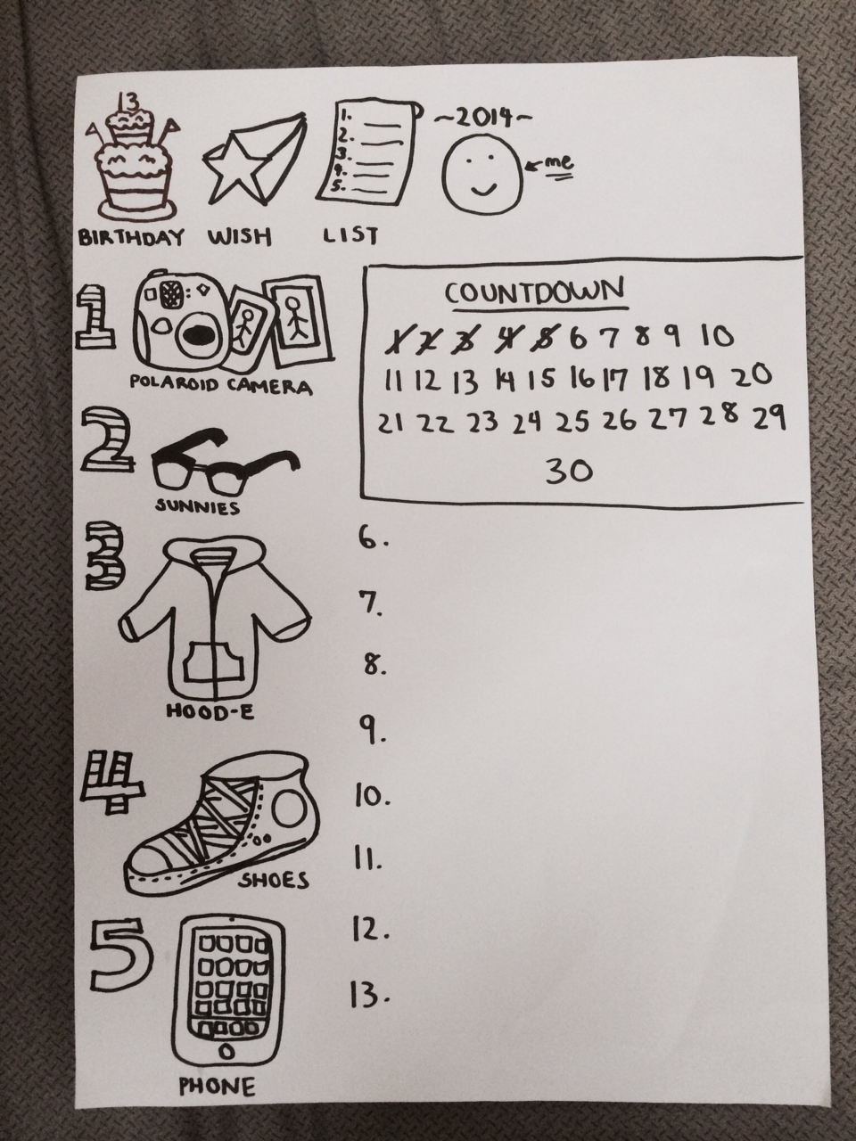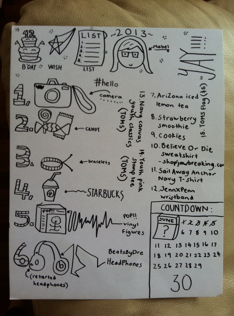 Despite the outlook of being all grown up, the child in her is very enthusiastic about the impending special day. Earlier in the month, she drew out, yes drew not write, her birthday wish list and showed me.