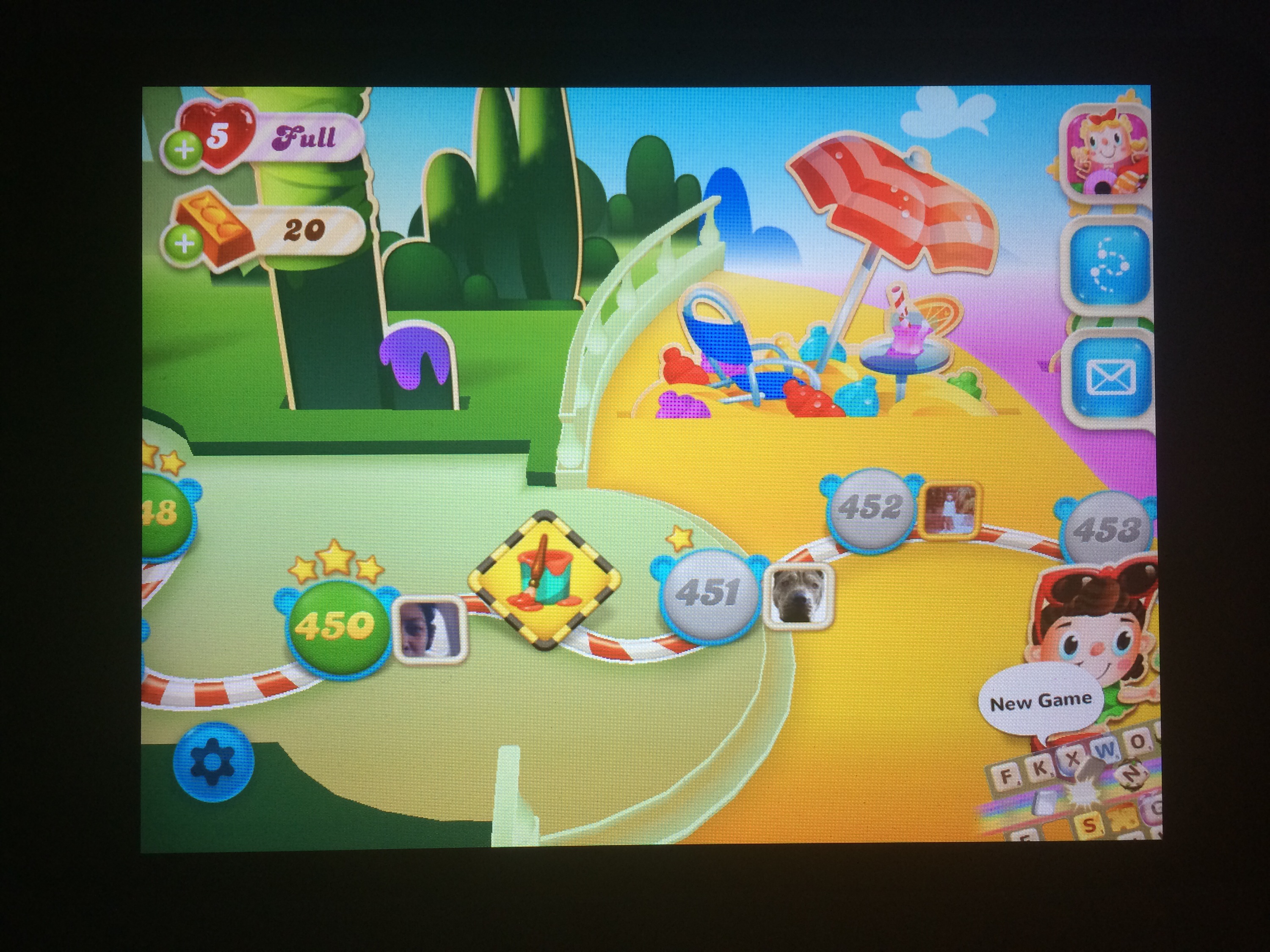 However, on the iPad, despite achieving a star for Level 451, the icon is grey and while my avatar is sitting at Level 452, its icon is also grey. Something is not right. Obviously grey means I can’t play on the iPad. Hrmph.