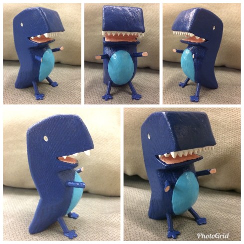 Over the weekend, I finally painted up Dinky the Dinosaur. And my… my… what beautiful white teeth it has! Towering over Gigglesville at four inches tall, it is looking rather fierce in dark blue but the dazzling white teeth and shiny light blue belly softens his fierceness to make it live up to its name.