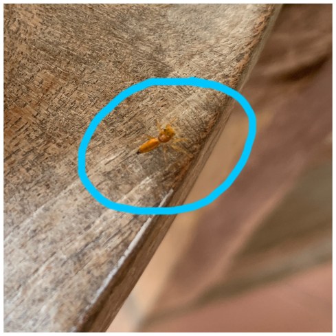 When I finally managed to cut through a little, two spiders escaped and I knew they were the culprits that killed the moth. The black and white one scurried away quickly but I managed to snap a quick picture of the second one, an orangy looking varmint. Murderers!