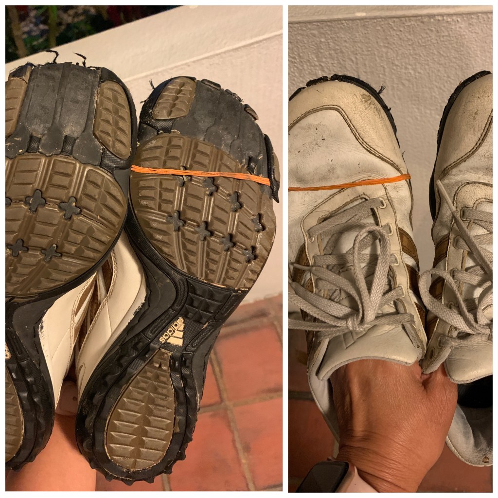 Eight holes later, the left outsole was flapping! Oh no, this is not good as we are only halfway through the game. I had to save the situation; otherwise, we cannot go on. Luckily, there were rubber bands on hubby’s golf trolley. So a quick DIY and the problem was resolved.