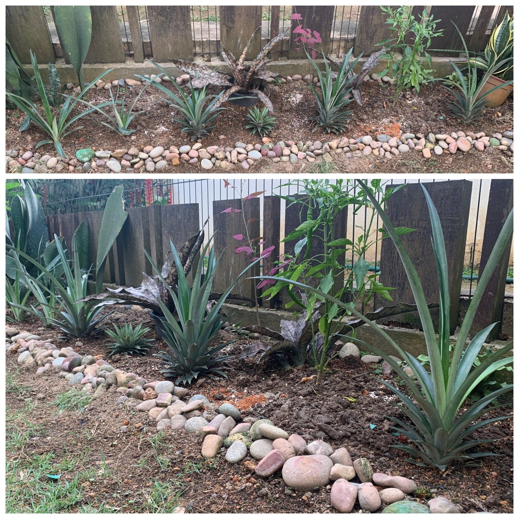 Hubby relocated all the pineapples to one plot instead of being in pots and scattered around the garden. I think they look good being there. Furthermore, the plot is easier to protect from the squirrels. Remember that one time, the rascal of the squirrel ate our pineapple right in front of our eyes?
