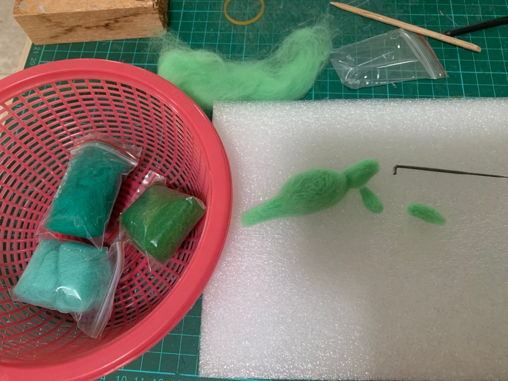 My latest felted character is a dinosaur, and my Dinky dinosaur has a friend! This character started as a stegosaurus, but as I progressed along, I decided to change the shape. Soon it evolved, and now it is a Tinysaurus, hahaha!