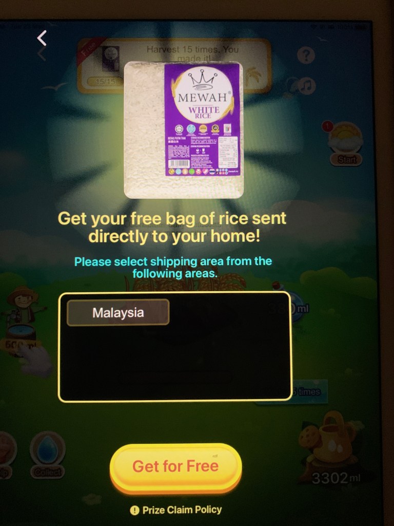 There’s no free lunch in this world, but there is free rice! For the past several months, I have been playing this game on Lazada, my local online shopping site, and the game gives out a kilo of free rice upon completing the harvest. Isn’t it wonderful?