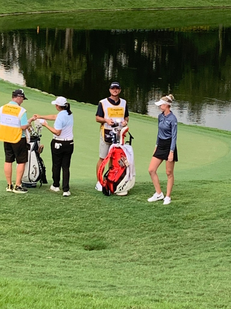 It was surreal to see all the LPGA players in person, although not quite as close but enough. We stayed at the Par 4, Hole 14, and Par 3, Hole 15 most of the time because they were side by side and had a great view. Separately, it was too hot to venture to the other holes. It was weird to see a call-on situation for a Par 4. Hole 14 was 364 yards (333 meters) but reachable for these pros.
