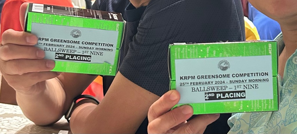 There was some consolation at the end, though, for our partnership won 2nd Placing for the Ball Sweep on the front nine of the Greensome Tournament. The focus paid off upon the cross-over, and we were rewarded with half a dozen balls each. Nice.