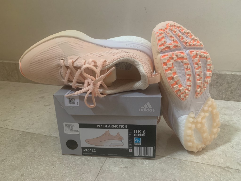 My peach-colored Adidas is still in good condition. It is a little dirty, but a good scrub can resolve this. On the other hand, my white/grey/green Adidas pair is showing significant wear, especially with both heel sections starting to detach. The end is near. Perhaps I can manage a couple more rounds before discarding them? I have to be careful and should not wear them until the bottom sole falls off during a round of golf!