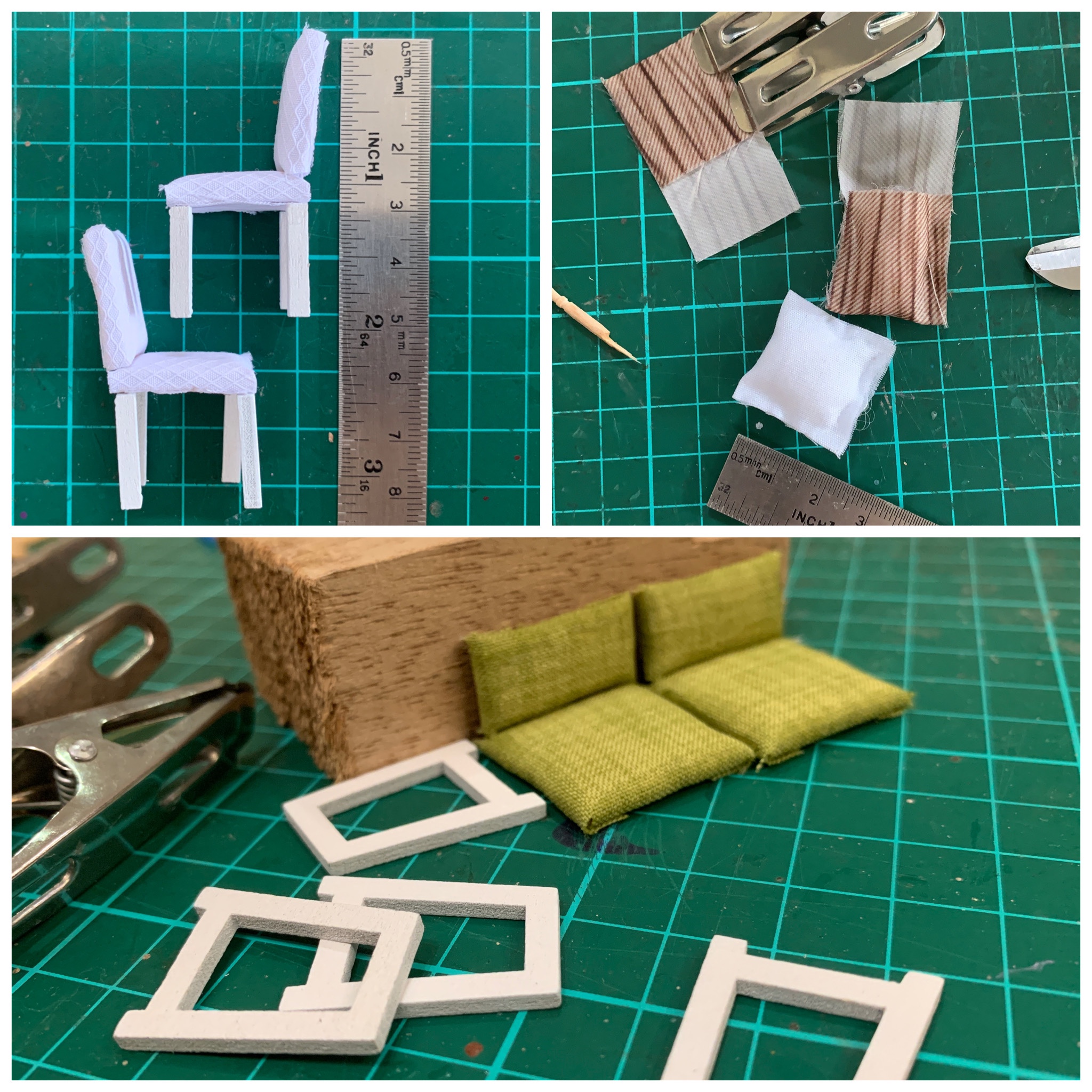 Once the kitchen chairs were finally completed, I worked on another equally aggravating set of chairs for the bedroom. And if I thought this was the ultimate test of patience and skills, making tiny pillows take the cake! I’ve managed only three pillows so far and have procrastinated on the last two.