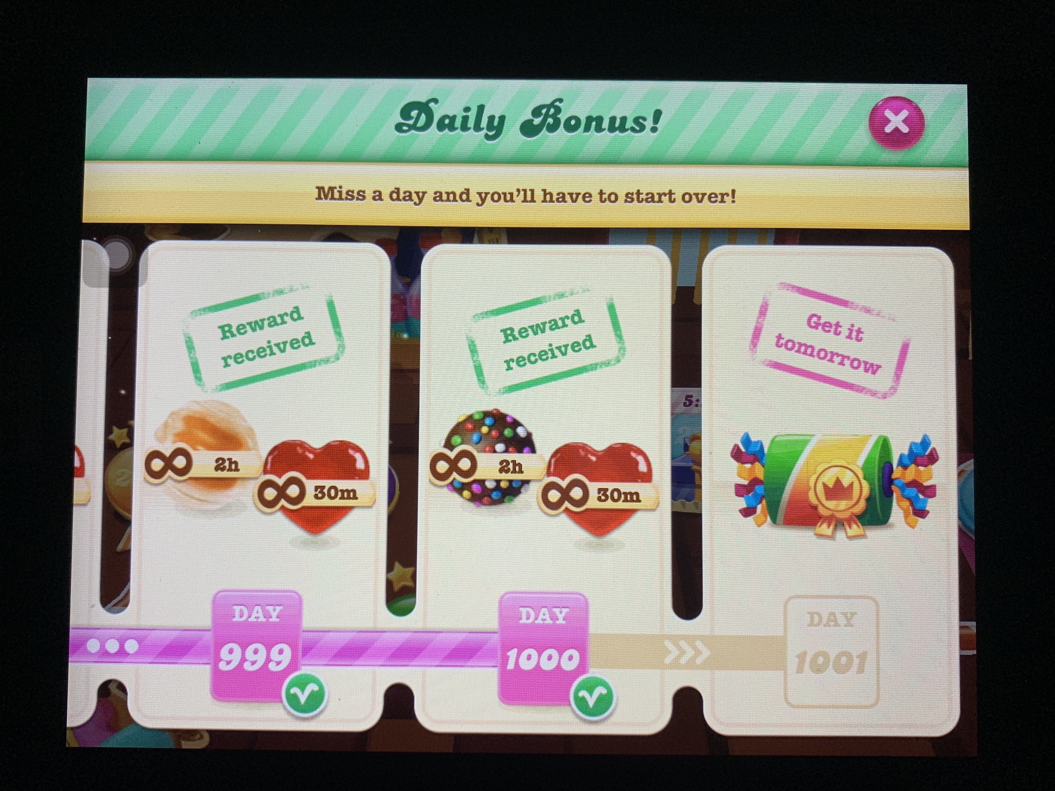 Yesterday I reached the unimaginable – 1000 consecutive days collecting Candy Crush Soda’s Daily Bonus! I have been at this for so long, it’s crazy. Who does this besides me?