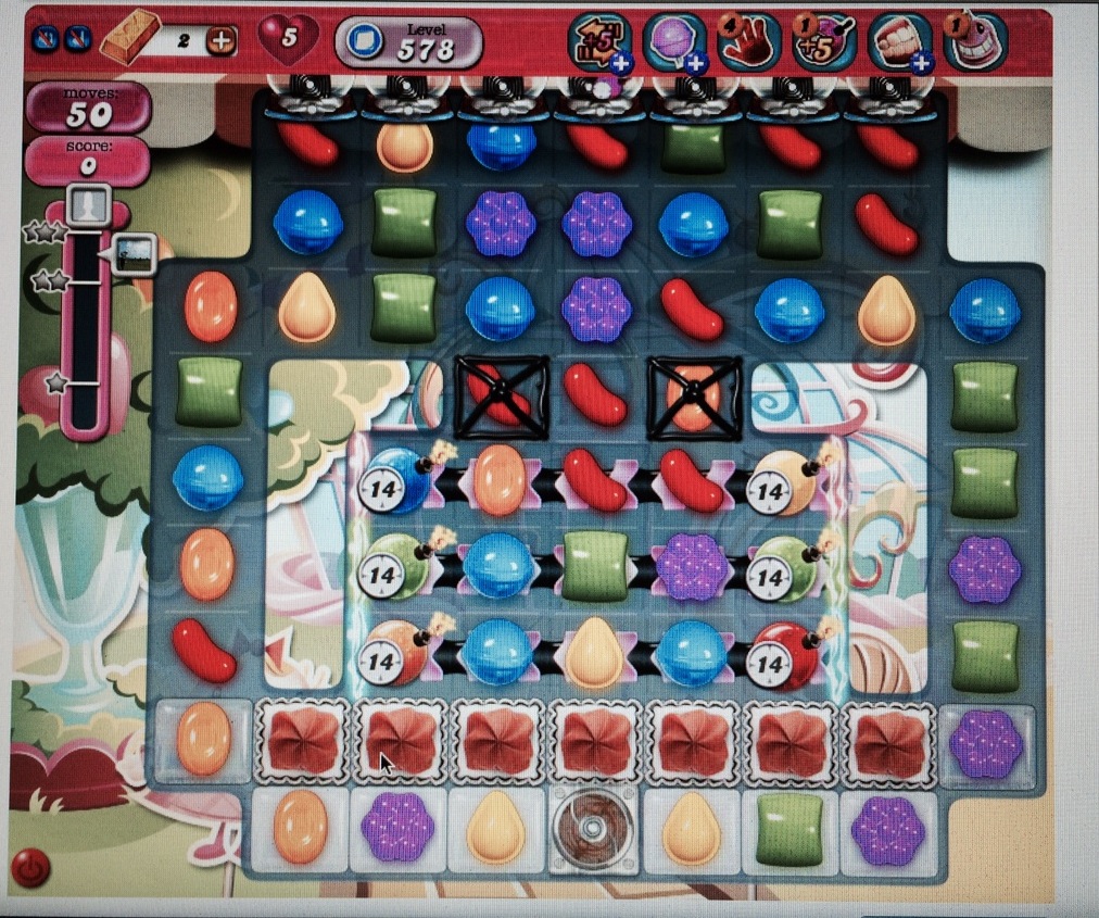 Level 578 in Facebook on the laptop. Notice the two side jellies, the brown blocks and where the chocolate maker sits.