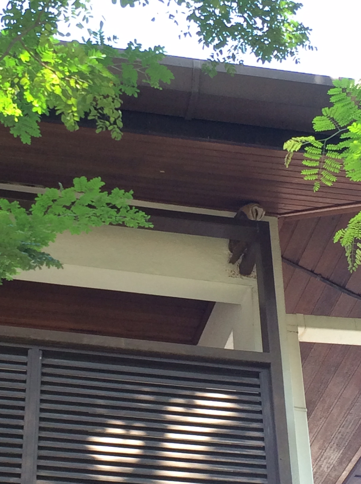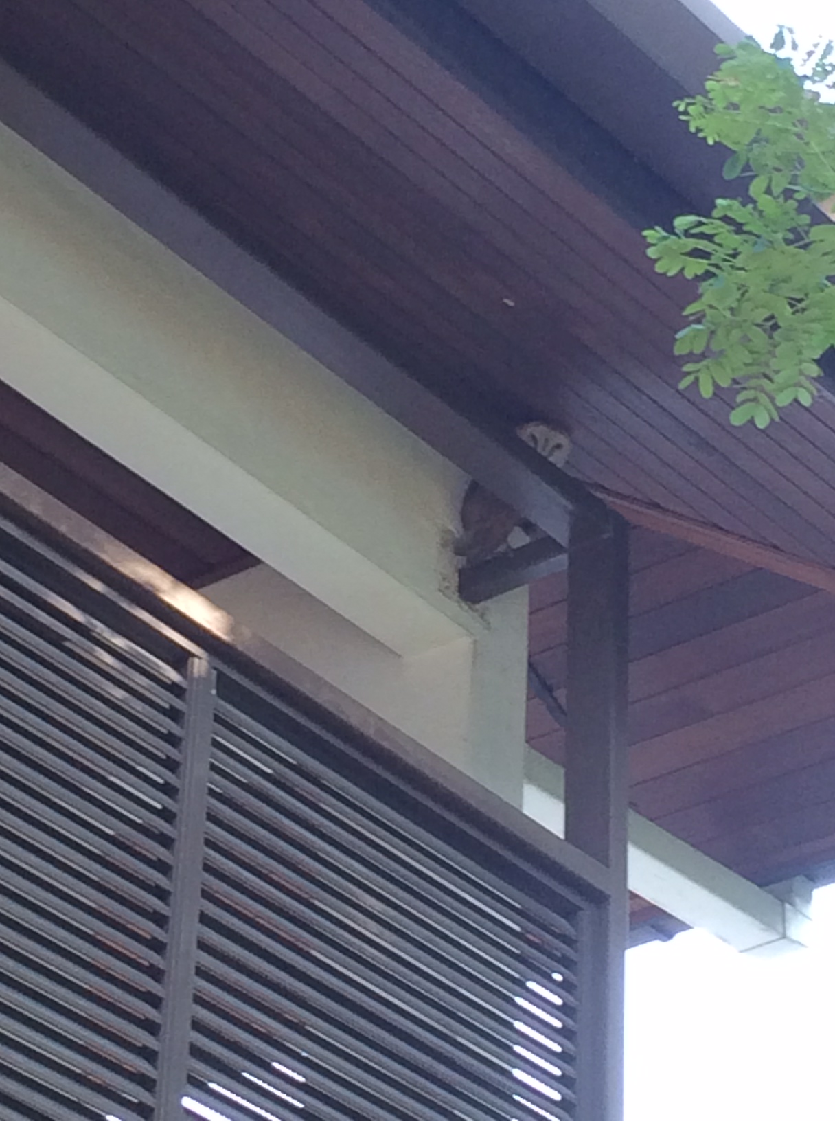 The little girl next door saw it too and aptly called it Barney (as in barn owl, get it?). So Barney hung with us the whole of Saturday. Every now and then, one of us would come out to check on it; it would lazily peek at us, sometimes turning only the head and other times, facing us frontal view and with a piercing stare. I was afraid it would fly off and took the pictures from afar, zooming in with the iPhone5S.