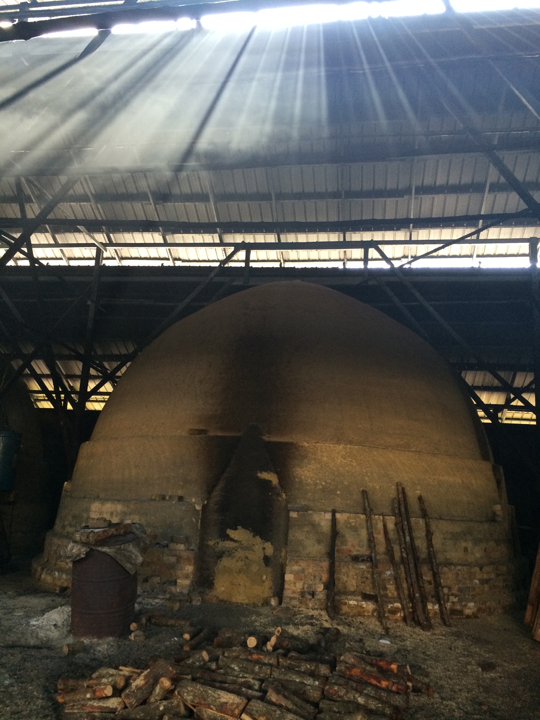 This kiln has yet to be sealed. Smoke coming out is actually the moisture from the wood. Foreground rubber wood are used for burning to smoke the mangrove wood